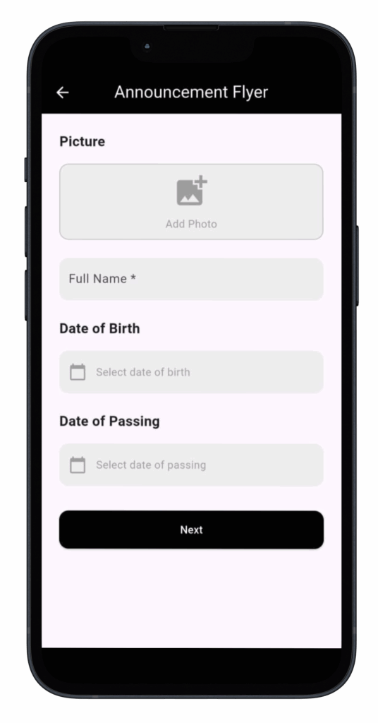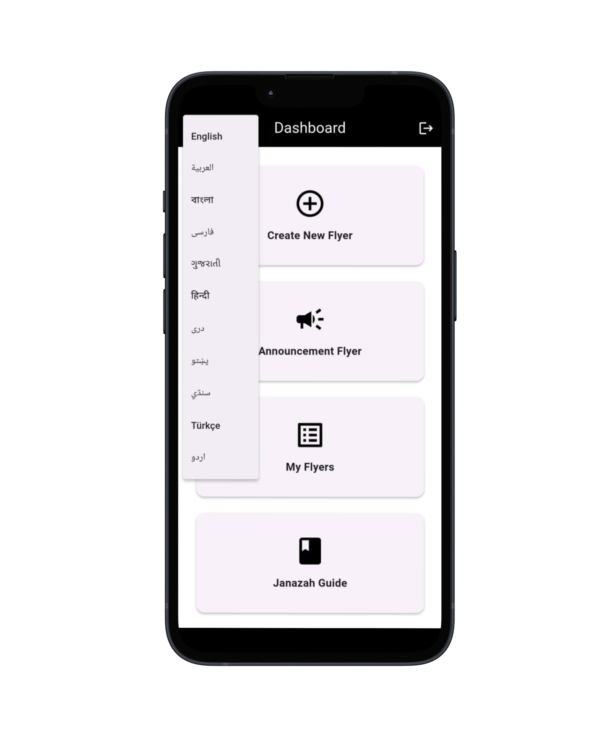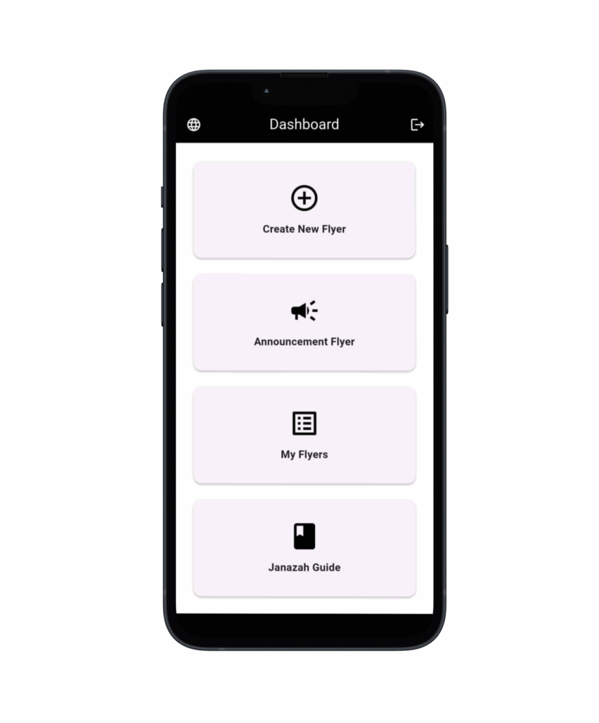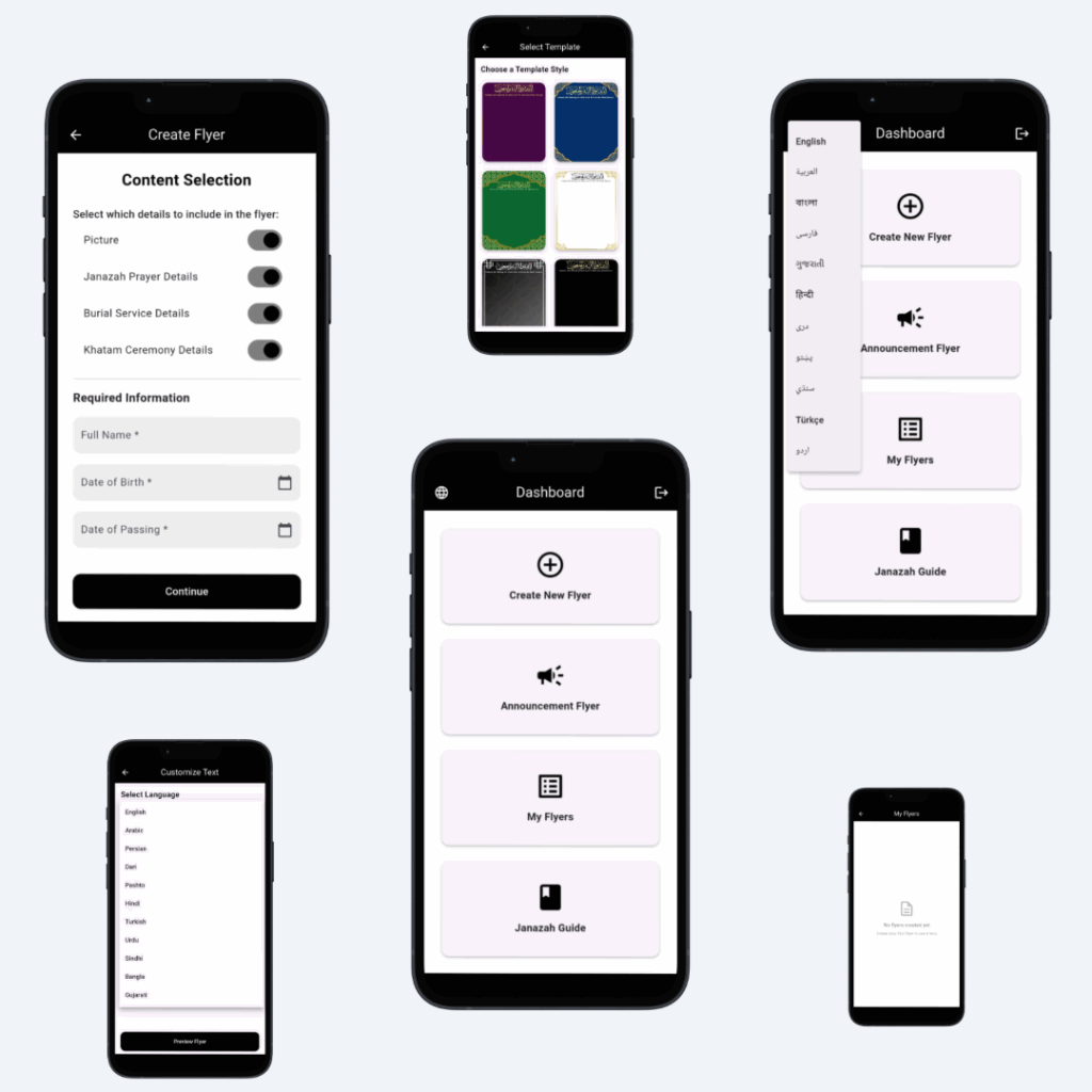 Simple Janazah flyers reimagined. Choose language → Fill in your info → Pick a